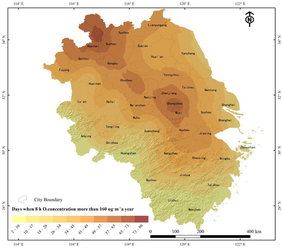 Distribution of days of 8 h O3 concentration exceeding the standard (>160 μg·m−3) within in the YRD urban agglomeration.