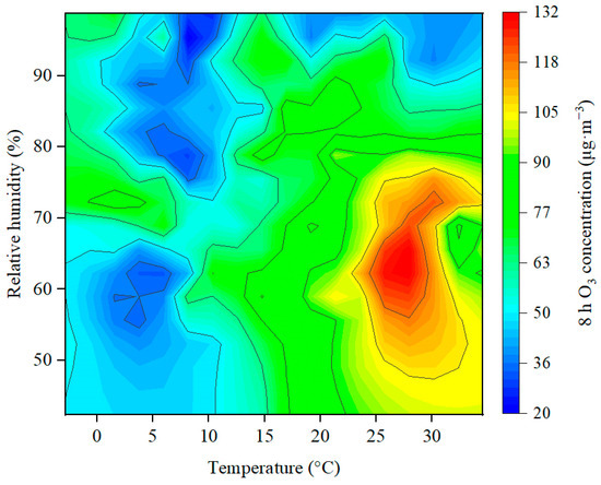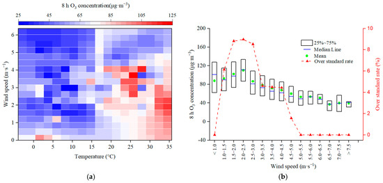 In contrast, under high-temperature conditions, high wind speeds could also lead to significantly lower 8 h O3 concentrations (Figure 8b). This was clearly reflected in the frequent occurrences of 8 h O3 exceedances during the summer (Figure 8b), indicating that, at this time, the unstable atmospheric stratification significantly enhanced the dispersion efficiency of regional pollutants, breaking the accumulation state of local pollution [9].