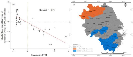 Influence of terrain on 8 h O3 concentration in the YRD urban agglomeration. (a) Moran scatter of 8 h O3 concentration and topographic roughness index; (b) LISA clustering map of 8 h O3 concentration and topographic roughness index.