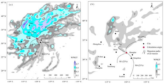 Supplying routes and potential contribution source areas of the contaminated air mass on an annual scale. The concentration thresholds were set as (a) the arithmetic mean and (b) the secondary concentration threshold (160 µg·m−3), respectively.
