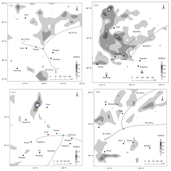 Using Changzhou, one of the core cities for O3 pollution, located at the geometric center of the regional geography, as the calculation origin, the HYSPLIT model was utilized to explore the potential source pathways of O3 substances [7,27]. On an annual scale, the southward inland pathway R1, which traversed the economically lagging northern part of the Jiangnan hills, accounted for approximately 23% of the total pathways (Figure 10 and Table 4). The average concentration of O3 in the transporting air masses and the proportion of paths exceeding the concentration threshold were 69.83 ± 37.64 μg·m−3 and 3.2%, respectively, both significantly lower than those of the northward inland path R2 (with an average concentration of 81.23 ± 51.82 μg·m−3 and a proportion exceeding the threshold of 8.9%) that passed through regions with concentrated energy mineral and steel industry activities [38]. The southward path R4, which traversed the southeastern coastal areas, and the northward path R3, located in the Yellow Sea, accounted for approximately 21% and 29%, respectively. The average concentration of R4 (55.93 ± 35.89 μg·m−3) and the proportion of paths exceeding the threshold (1.6%) were approximately 69% and 22% of those observed for R3 (with an average concentration of 80.78 ± 47.67 μg·m−3 and a proportion exceeding the threshold of 7.4%). Therefore, pollutants originating from the supply of northward air masses were likely the main cause of the elevated O3 concentrations within the YRD urban agglomeration, while the contribution of human-emitted precursors in the economically and industrially concentrated urban areas of Shanghai, Nanjing, and Hangzhou was relatively weak. This was primarily because the relatively abundant precipitation in the lower reaches of the Yangtze River had reduced the concentration of precursor substances in the atmosphere through washout [43], while sea–land winds had also facilitated the diffusion of precursor substances into the ocean [44].
