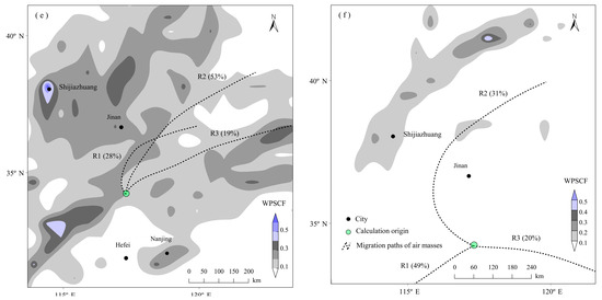 Potential source contribution areas of O3 substances in (a) spring, (b) summer, and (c) autumn base on the calculation origin of Changzhou City, and in (d) spring, (e) summer, and (f) autumn base on the calculation origin of Xuzhou City. The concentration threshold was 160 μg·m−3 (i.e., the secondary concentration threshold).