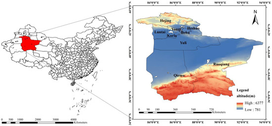 This study focuses on the Bayingol Mongolian Autonomous Prefecture in the southeastern part of Xinjiang Uygur Autonomous Region, China. Geographically, the study area extends approximately from 35°38′ to 43°36′ N latitude and 82°38′ to 93°45′ E longitude, encompassing an area of about 471,500 km2, which represents roughly a quarter of Xinjiang’s total territory (Figure 1). Deserts and Gobi terrains dominate approximately 143,000 km2 of the region, accounting for about 30.3% of the total prefecture area. The local climate is semi-arid desert–steppe, with low annual precipitation and frequent strong winds. This region administratively comprises nine counties and cities: Korla, Yuli, Qiemo, Ruoqiang, Luntai, Bohu, Yanqi, Hejing, and Heshuo.