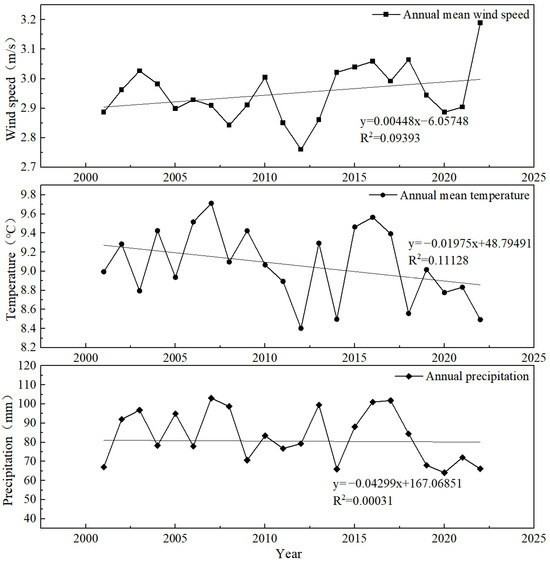 Changes in annual mean wind speed, temperature, and annual precipitation in Bazhou from 2001 to 2022.