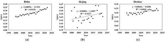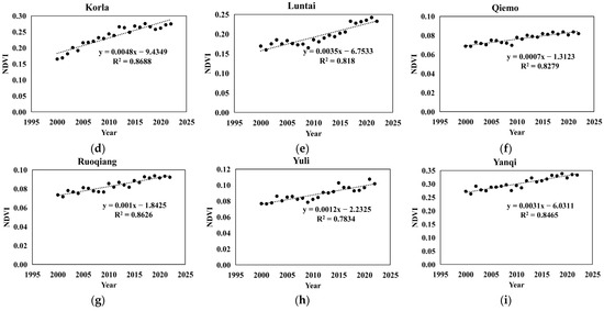 From 2001 to 2022, the annual mean NDVI in Bazhou showed a clear increasing trend. The rates of increase across the counties, ranked in descending order, were as follows: Bohu (0.0059) > Korla (0.0048) > Luntai (0.0035) > Yanqi (0.0031) > Heshuo (0.0026) > Yuli (0.0012) > Ruoqiang (0.0010) > Hejing (0.0009) > Qiemo (0.0007), with an overall average rate of 0.22 × 10−2 per year. Although these results indicate an overall improvement in vegetation growth across the region over the past two decades, the magnitude of change has remained relatively modest.