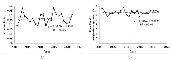 Changes in climate factor and Thorn Thwaite index in Bazhou from 2001 to 2022: (a) climate factor, (b) Thorn Thwaite index.