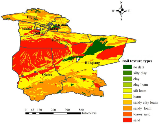 The soil texture data utilized in this study were acquired from the National Cryosphere Desert Data Center (http://www.ncdc.ac.cn/ (accessed on 17 October 2024)) Harmonized World Soil Database version 1.1 (HWSD) of the World Soil Database, with a spatial resolution of 1 km.