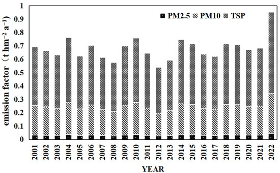 Changes in the emission factor of TSP, PM10, and PM2.5 of soil dust sources in Bazhou from 2001 to 2022.
