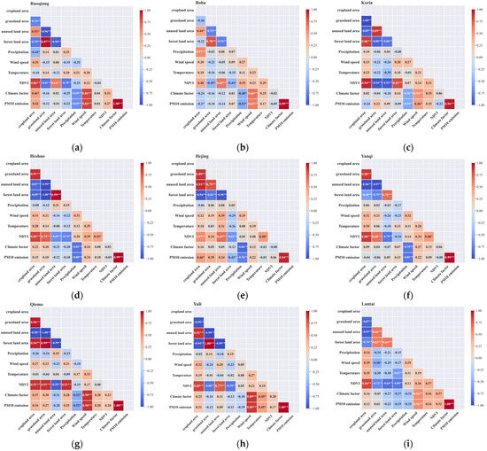 Heatmap of the correlation between emissions of PM10 and other factors across counties in Bazhou: (a) Ruoqiang; (b) Bohu; (c) Korla; (d) Heshuo; (e) Hejing; (f) Yanqi; (g) Qiemo; (h) Yuli; (i) Luntai. * p < 0.05, ** p < 0.01.