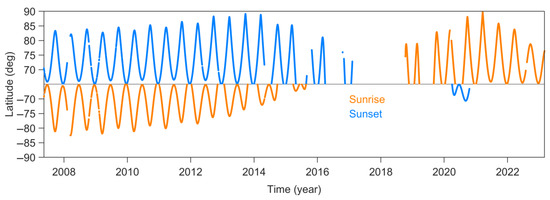 Spatiotemporal distributions of T, QV, and p in the mesopause, used in parameterization (see Section 2.1), are taken from the measurements of the Solar Occultation for Ice Experiment (SOFIE; [27]) onboard the sun-synchronous satellite of the Aeronomy of Ice in the Mesosphere (AIM; [28]), which started to operate in 2007, on April 25. The sensor measures solar radiation flux, attenuated by passing through the atmospheric limb, both at the rising and setting of the star above the horizon relative to the satellite position. Based on the collected information, vertical profiles of T, p, and five gas components (H2O, O3, CH4, NO, and CO2) are retrieved, such as aerosol extinction coefficients at several wavelengths. SOFIE has 8 channels, each tuned to a pair of spectral bands, and covers a wide wavelength range from 0.3 to 5 µm. The sensor performs 15 sunrise and 15 sunset scans per day in the latitude band 65–85° in both hemispheres (except for 2016–2018, when AIM orbit changes were performed and measurements did not extend beyond midlatitudes; see Figure 1). Each vertical profile covers an altitude range of 20–95 km and has a 0.2 km vertical resolution.