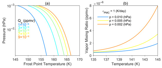To understand the effect of external factors on heating variability, the sensitivity of the parameterization to variations in background conditions (T and p) was calculated. The 0-D model allows us to automate the search for areas where PMC formation is possible using the frost point and different QV concentrations. Ts values were calculated for five different QV concentrations (1, 3, 5, 7, and 9 ppmv) and a range of p values equivalent to altitudes of 75–95 km. Depending on p and QV, the frost point can vary over a wide range, but as can be seen in Figure 2a, for values of QV > 7 ppmv, Ts changes are relatively small. Moreover, starting from the level of 0.01 hPa (equivalent to an altitude of about 80 km), the bottom of the cloud formation layer, all Ts values are overestimated relative to the actually observed temperatures in the mesopause (e.g., [34]), which is a favorable condition for sublimation of water vapor into ice.