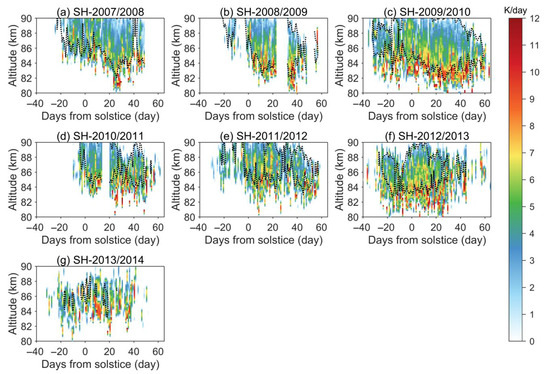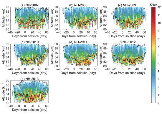 The PMC season lasts from May to August in the NH and from November to February in the SH. Complete dissipation of the PMC occurs due to the change of the thermodynamic regime of the polar MLT. The central date of each cloud season is the summer solstice. Vertical profiles of T, QV, and p were selected for the Ts calculation. Further, all values of temperature when T > Ts were excluded from the subsequent calculations, as far as the conditions necessary for cloud formation were not achieved. After calculating and other related variables, heating rates (εPMC, K/s) were calculated for each remaining vertical profile. Then these heating rates were averaged for each day and converted to daily rates (K/day). Figure 3 and Figure 4 show the altitudinal and temporal structures of daily mean εPMC values for the 14 seasons considered. It can be seen that the maximum εPMC values are concentrated in the bottom part of the low-temperature region; the 150 K isotherm is drawn in these figures to indicate its boundaries.