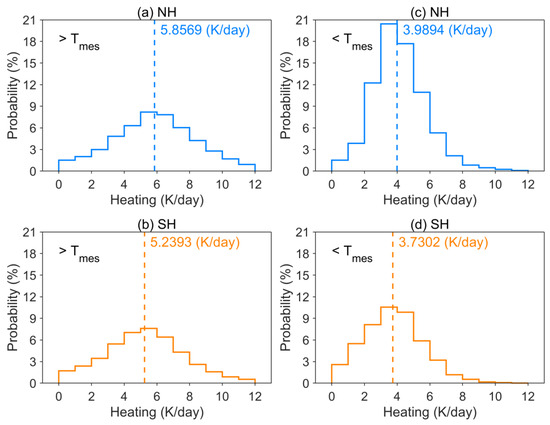 Figure 5 shows histograms of the distribution of εPMC values for all seasons in both hemispheres. For quantitative assessment, the εPMC was divided into layers: layers above and below the Tmes level. The histograms in Figure 5a,b correspond to the area of maximum Qice values (where the maximum heating is concentrated). The median values for NH and SH are 5.86 and 5.24 K/day, respectively, i.e., the differences are about 11%. It should be noted that the distribution in both hemispheres is symmetric with respect to each other. Maximum εPMC values > 10 K/day occur in the same zone. Above the Tmes level (Figure 5c,d), small εPMC values are concentrated, and the interhemispheric differences are ~7%. The shape of the distribution in the NH is also different, which is probably due to the large number of measurement gaps. Overall, the heating patterns both above and below Tmes in both hemispheres are similar. That is, PMCs affect the mesopause heat balance equally in both the NH and SH. At the same time, according to the calculations, an increase in QV is expected to enhance the formation of PMCs and, consequently, to strengthen the parameterized heating.
