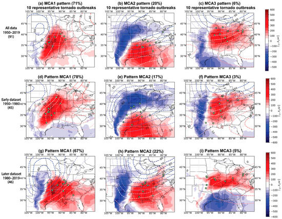 To investigate the temporal stationarity of tornado outbreak-associated patterns in ERA5 reanalysis, we analyzed the first three leading modes of covariability, MCA1, MCA2, and MCA3, between May 500-hPa geopotential height anomalies and anomalous WMAXSHEAR, which together account for 71%, 20%, and 6% of the covariance, respectively (Figure 1a–c). For this analysis, the data were divided into early (1950–1980) and later (1980–2019) periods, and an MCA was applied to each subset separately to assess whether these patterns remained consistent over time. The resulting modes are illustrated through homogeneous regression maps (Figure 1a–c). To highlight their geographic distribution in reference to the pattern itself, we marked ten significant tornado outbreaks per pattern, selected based on the highest values of the time series (see Figure 2b,d,f in Ćwik et al. [29]). To test if the identified spatial patterns are stationary in time, we subdivided the dataset into the early and later dataset (Section 2.2) and applied an MCA to each subset. We mapped the top three modes for the early dataset (Figure 1d–f), representing 78%, 17%, and 3% of the covariance, respectively, and the later dataset (Figure 1g–i), representing 67%, 22%, and 5%.