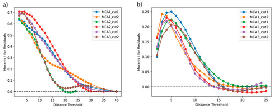 Effects of different distance thresholds on spatial autocorrelation (Moran’s I) in residuals of (a) 500-hPa geopotential height anomalies and (b) WMAXSHEAR anomalies for each subset across all MCA patterns.