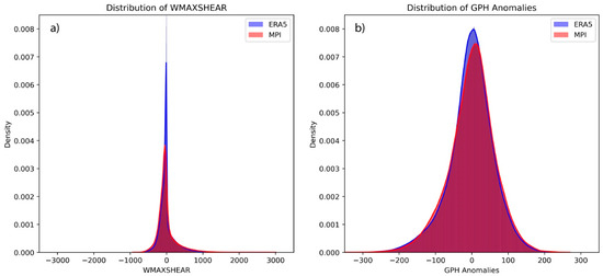 Distribution of (a) WMAXSHEAR anomalies and (b) 500-hPa geopotential height anomalies for ERA5 and MPI data. The summary statistics for WMAXSHEAR: ERA5: mean = −0.98, median = −27.00, skewness = 1.95, and standard deviation = 220.31; for MPI: mean = −1.17, median = −50.18, skewness = 1.96, and standard deviation = 268.91. Similarly, for 500-hPa geopotential heights: ERA5: mean = −1.72, median = 1.61, skewness = −0.44, and standard deviation = 62.14; and MPI: mean = −0.04, median = 3.68, skewness = −0.34, and standard deviation = 63.89.
