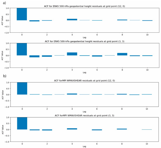 Temporal autocorrelation was evaluated using the autocorrelation function (ACF) for 6-hourly data (Figure 4a,b), revealing a rapid decline within the first few lags, indicating limited short-term memory in both datasets. Spatial autocorrelation was mitigated by applying a spatial weights matrix, reducing artificial similarity between neighboring grid points. Finally, we used a Kolmogorov–Smirnov (KS) test to compare the spatial distributions of the residuals, employing 1000 spatial permutations within 5 × 5 grid blocks to generate a null distribution. The results indicated no statistically significant differences between MPI and ERA5 residuals (KS statistic: 0.043, p = 0.1 for WMAXSHEAR; 0.058, p = 0.1 for 500-hPa geopotential height anomalies), and these outcomes remained consistent across different block sizes and permutation counts.