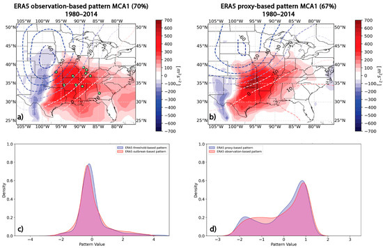 (a) ERA5 MCA1 observation-based pattern, i.e., based on 45 tornado outbreaks for years 1980–2014. (b) ERA5 MCA1 proxy-based pattern, i.e., based on threshold values, for years 1980–2014. Distribution comparison of normalized residuals for proxy-based and tornado observation-based patterns in (c) WMAXSHEAR anomalies and (d) 500-hPa geopotential height anomalies.