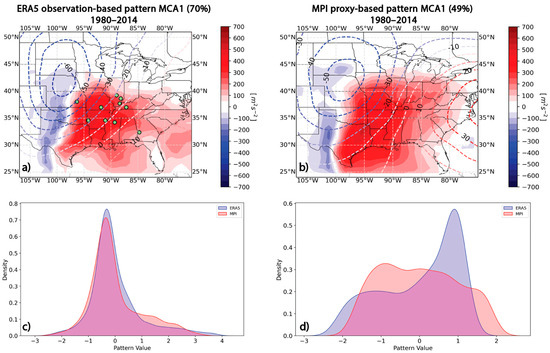 Given the lack of stationarity across all patterns, we intentionally focus our subsequent analysis solely on MCA1 for two primary reasons. First, MCA1 explains the largest fraction of covariability in the dataset, making it a particularly informative pattern for understanding outbreak-supportive environments, as it best characterizes the typical or dominant way in which the two fields (WMAXSHEAR and 500-hPa height anomalies) co-vary during tornado outbreaks. We restrict this analysis to the 1980–2014 period to ensure relevance to contemporary conditions and to match the temporal range of the MPI simulations. Second, MCA1 closely resembles large-scale patterns linked to tornado activity in previous studies, including the Pacific Ridge regime described by Tippett et al. [13] and similar configurations noted by Agee et al. [52], Gensini and Brooks [27], and Li et al. [45]. In ERA5, MCA1 features a deep 500-hPa trough over the western and central U.S., with ridging to the east, enhancing low-level moisture transport and instability across the central Plains. This structural similarity further supports MCA1 as the representative pattern for outbreak environments in both reanalysis and model simulations.