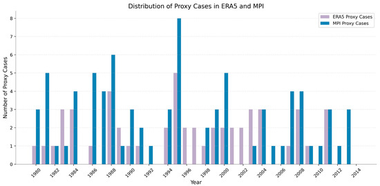 Temporal distribution of proxy cases identified using ERA5 (n = 52) and MPI (n = 80) datasets between 1980 and 2014.