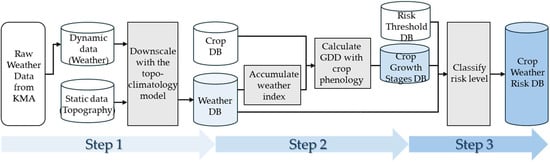 The existing AgEWS in South Korea is designed to precisely predict weather risks at the farm level and provide farmers with guidelines to support their decision making [8,9]. This section briefly describes the data processing procedure for generating early warnings and countermeasure suggestions.