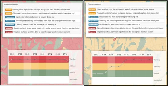 The current structure of countermeasure data (Table 1) fails to adequately reflect variations in cultivation season, environmental conditions, and crop varieties, and it also falls short in providing countermeasure data differentiated by the level of agrometeorological disaster. For instance, northern and southern types of garlic are classified as the same crop. However, their cultivation seasons differ significantly, leading to seasonal climatic conditions and phenology differences. As a result, even at the same growth stage, their vulnerability to agrometeorological disasters may vary, necessitating differentiated countermeasures. However, under the current structure, such varietal and cultivation-specific differences are not considered, resulting in the application of uniform countermeasures across all situations. In addition, although AgEWS classifies disaster risk into multiple stages, such as ‘normal’, ‘advisory’, and ‘warning’, the corresponding countermeasure data provide the same countermeasure recommendations regardless of risk level, indicating a lack of differentiation based on severity (Figure 2).