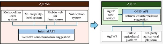 To actualize continuous data updating and provide local customized countermeasures tailored to each jurisdiction, overcoming the limitation of centralized countermeasure data provision conducted by the central government, AgCP is designed to have the core functions listed in Table 6. This standard model is focused on resolving the problem of a lack of updates, which was pointed out as a significant limitation of the existing AgEWS.