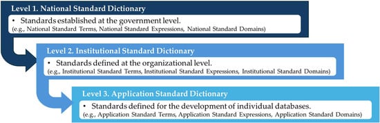 In South Korea, public data standardization is formally governed by the Common Standard Terminology with a three-level hierarchical framework, national-level, institutional-level, and application-level, as stipulated in Article 23 of the Act on Promotion of the Provision and Use of Public Data (the “Public Data Act”) and operationalized through the Guidelines on Database Standardization for Public Institutions [25]. This tiered structure is designed to guarantee semantic consistency across administrative units, enabling all users to interpret and utilize public data uniformly [26].