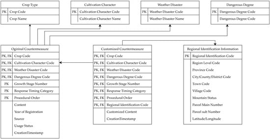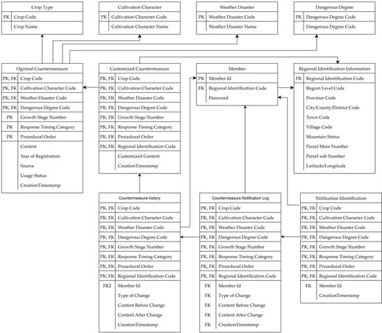 Key entities identified through modeling include Member, Regional Identification Information, Original Countermeasure, Crop Type, Risk Level, Cultivation Attribute, and Meteorological Disaster. The Customized Countermeasure serves as the main entity for user-driven data operations. Action entities include Countermeasure History, Countermeasure Notification Log, and Notification Identification, each generated through user interactions (Table 4).