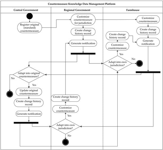 The countermeasure data management flow in AgCP has a structure that starts with the central government registering original countermeasure data and then links to other users’ making, sharing, and accommodating the data (Figure 7).