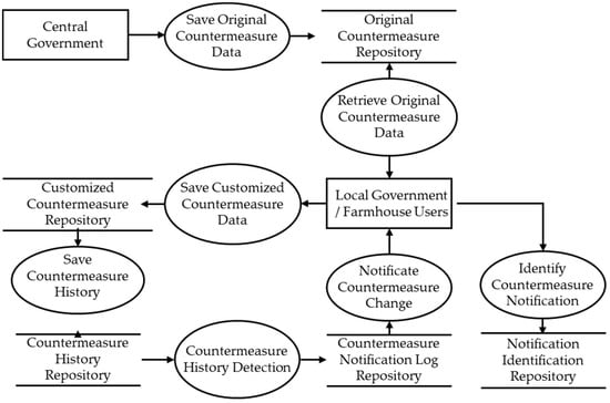 The central government initially registers the original countermeasures in the system, which are made available for modification by local governments and farmhouses according to their specific conditions. When a user edits a countermeasure, the updated content is saved in the customized countermeasure repository, and a corresponding entry is automatically recorded in the countermeasure history repository. Once the system detects a change in the countermeasure, it immediately sends notifications to all users except the one who modified. When a recipient checks the notification, this confirmation is logged in the notification identification history repository.