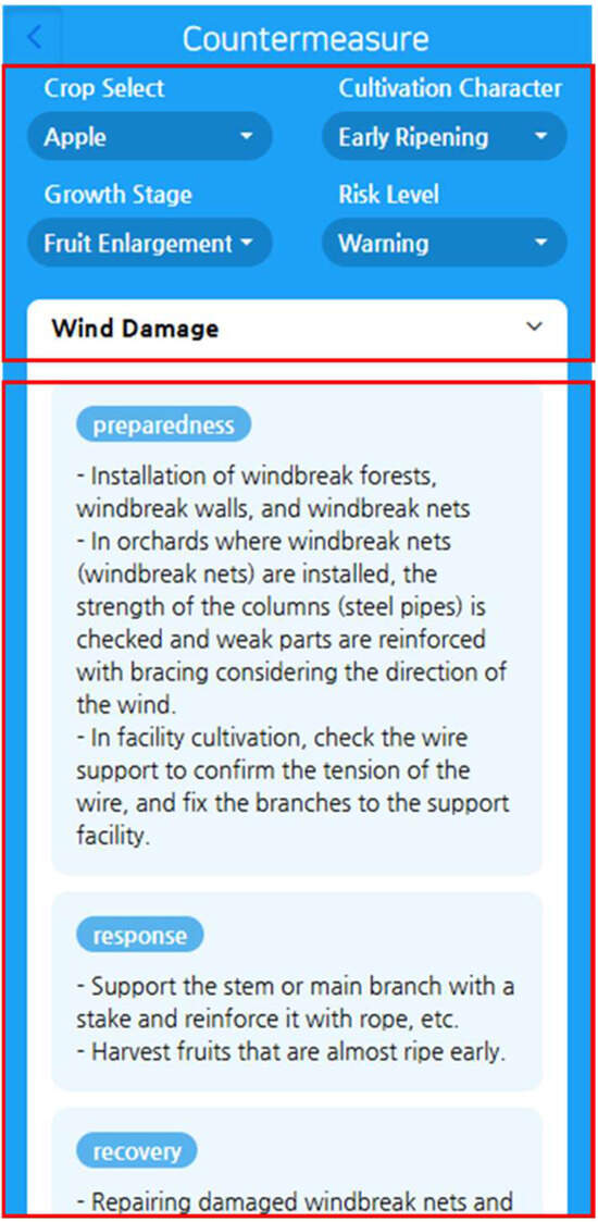 The countermeasure suggestions provided by AgEWS are constructed based on agricultural literature and classified according to crop growth stage and agrometeorological disaster type. Countermeasures are categorized into preparedness, response, and recovery according to the response timing. The data structure includes attributes such as crop, growth stage, meteorological disaster, countermeasure type, and detailed guidelines, enabling specific queries based on attribute combinations (Table 1).