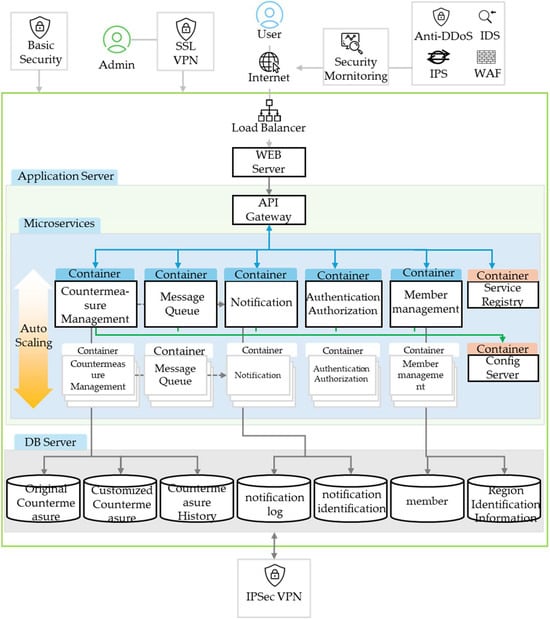 Each microservice has its own logically separated database, with read/write permissions restricted to the tables relevant to its functional responsibilities. The countermeasure management service manages original countermeasures, customized countermeasures, and countermeasure history. The notification service manages notification and identification logs, while the member management service is responsible for member and regional information. Other services requiring user information can be accessed indirectly via internal API calls.