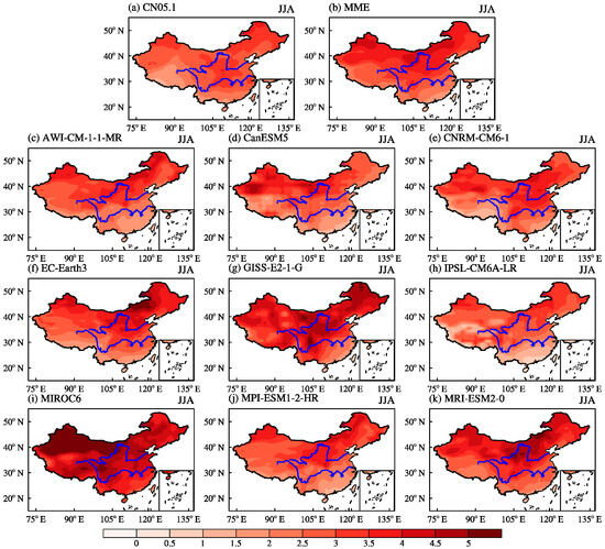 Climatological summer Tmax variability, quantified as the standard deviation of Tmax anomalies (unit: °C), over China for the period 1979–2014 from (a) CN05.1, (b) multi-model ensemble (MME), and (c–k) individual climate models that participated in CMIP6. The upper thick blue line denotes the Yellow River, and the lower one represents the Yangtze River.
