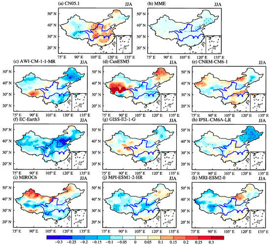 Temporal trends of summer Tmax variability (unit: °C/decade) from (a) CN05.1, (b) MME, and (c–k) individual climate models that participated in CMIP6. The stippled areas indicate trends with statistical significance exceeding the 95% confidence level. The upper thick blue line denotes the Yellow River, and the lower one represents the Yangtze River.