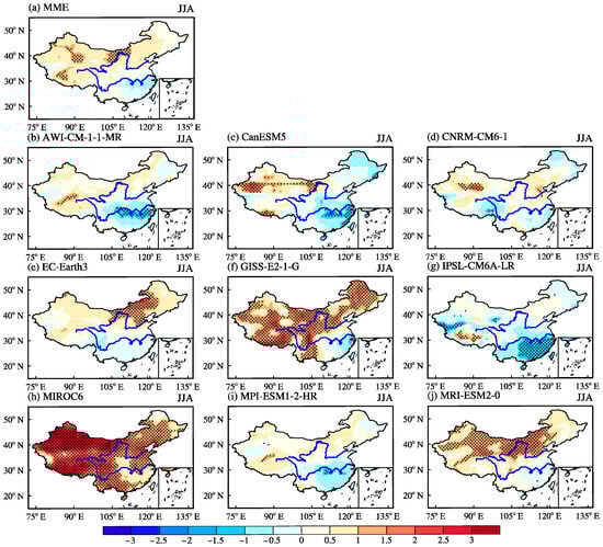 Differences in summer Tmax variability between CMIP6 (a) MME, (b–j) individual climate models, and CN05.1 over China for the period 1979–2014. The stippled areas indicate differences with statistical significance exceeding the 95% confidence level. The upper thick blue line denotes the Yellow River, and the lower one represents the Yangtze River.