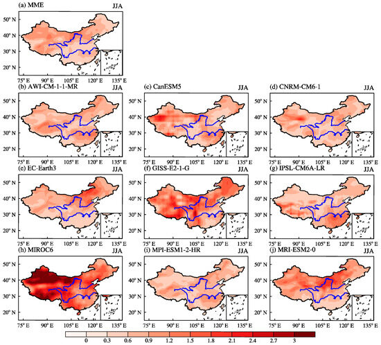 Root-mean-square error (RMSE) of summer Tmax variability from CMIP6 (unit: °C) (a) MME and (b–j) individual climate models compared against the CN05.1 data over China during 1979–2014. The upper thick blue line denotes the Yellow River, and the lower one represents the Yangtze River.