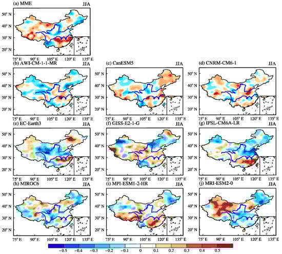 Correlation coefficients between summer Tmax variability from CMIP6 (a) MME, and (b–j) individual climate models and CN05.1 over China during 1979–2014. The stippled areas indicate correlation coefficients with statistical significance exceeding the 95% confidence level. The upper thick blue line denotes the Yellow River, and the lower one represents the Yangtze River.