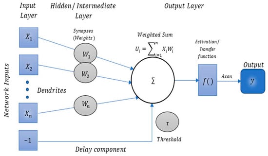 The ANN is a modeling method uniquely designed to predict several erratic and non-linear activities, like atmospheric events, or handle cumbersome data that simple statistical or numerical methods cannot easily handle [7,15]. This technique can carry out special tasks like recognizing, connecting, and generalizing trends based on its ability and enhancement processes, which involve its data learning functions to technically imitate the dimensions of the human brain [7,16]. A characteristic ANN network groups and controls the network inputs to attain a proper response for a predictable output within a reliability limit. The general model of the ANN technique is illustrated in Figure 1, which is in the form of a nodal network. This comprises certain nodes that are trained through several pieces of information arising from internal or external conditions of the system. Firstly, the inputs are allotted random weights, which are always altered until the output is attained at a suitable error level. Therefore, this training process of the network, which involves the conversion of the obtained weighted sum, ends when an expected error margin is achieved. The weighted sum is the addition of the multiplication of each of the entries and the allocated weights. In cases where a suitable error has not been attained, the training process continues with new estimations through an error correction of data entries referred to as the back propagation scheme [7,15,16].
