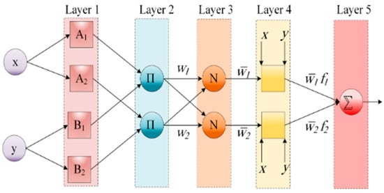 A typical ANFIS network displaying two inputs with five layers is shown in Figure 2. The rules generated and implemented by this model are utilized to produce accurate results and are important for achieving optimal efficiency in future data [18].
