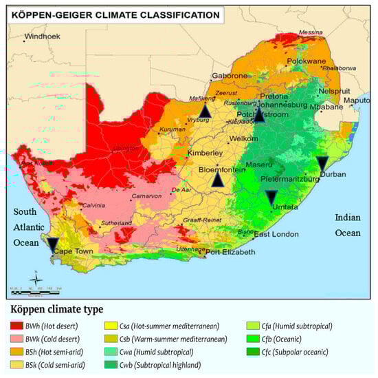 Map of the climatic zones of South Africa, showing the study sites ([22]).