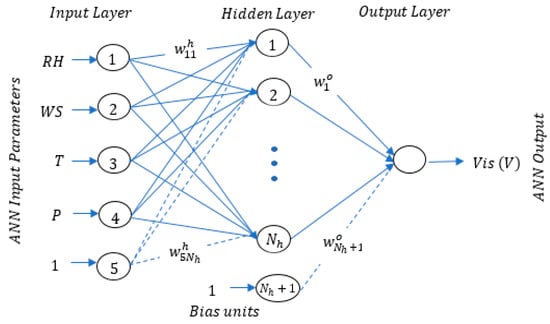 In this type of multi-layer neural network (shown in Figure 4), there are three main layers (i.e., input, intermediate or hidden, and output layers), which are the nodes connected by a certain amount of network neurons. These neurons perform the processing and then calculate the output based on the established connection existing between the three layers and the weights as well as the biases . As shown in Figure 4, the input variables are RH, T, P, and WS, while the output variable is visibility .