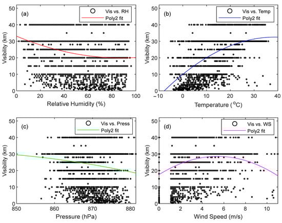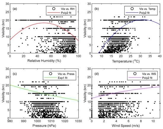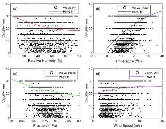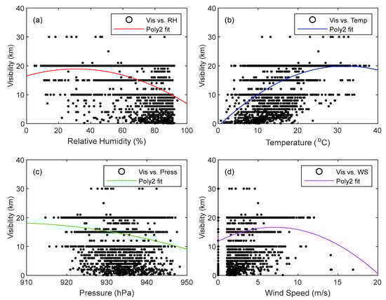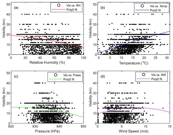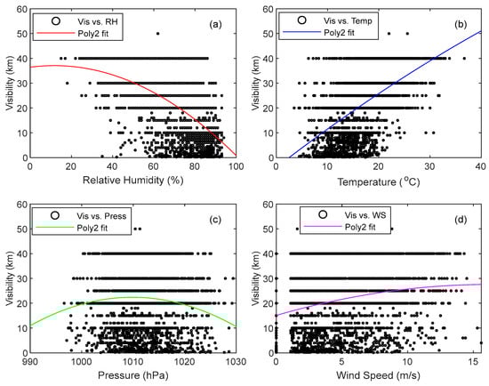 The SST—specifically, the SVRA—was used to determine any apparent relationship between and all considered meteorological variables. This was accompanied by regressing the visibility phenomenon against the various meteorological variables. Figure 5, Figure 6, Figure 7, Figure 8, Figure 9 and Figure 10 show the non-linear relationships between various atmospheric parameters and visibility using the SST throughout the year 2013 for all cities considered in this study. The error results of these non-linear regression fits, in terms of , are presented in Table 2.