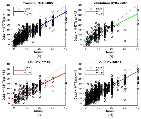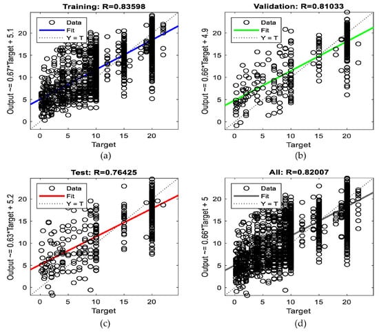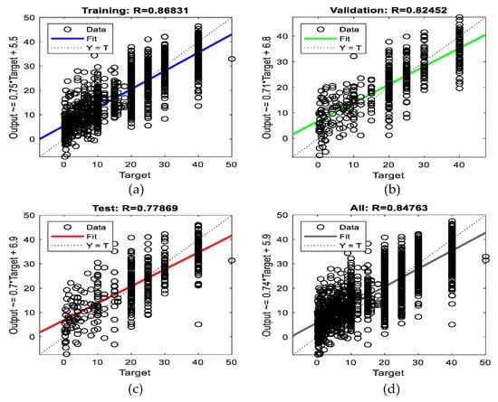 ANN model regression plots for (a) training; (b) validation; (c) testing; and (d) all data throughout the year 2013 for Cape Town.