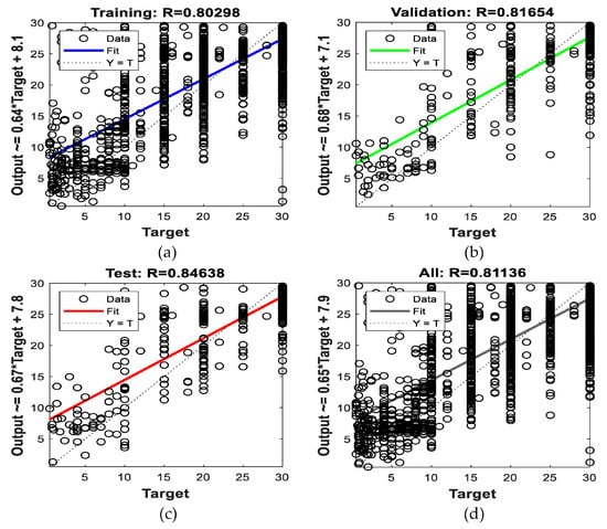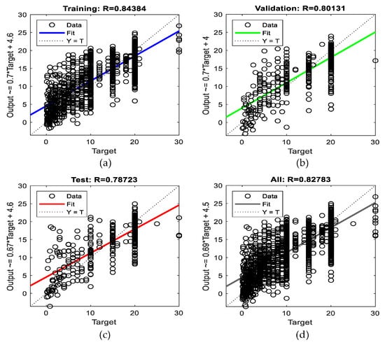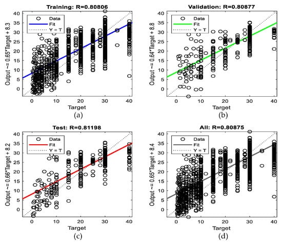 ANN model regression plots for (a) training; (b) validation; (c) testing; and (d) all data throughout the year 2013 for Mahikeng.