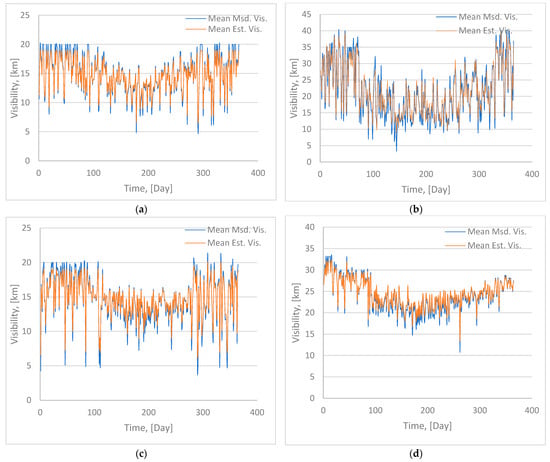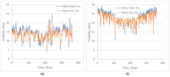 Figure 17a–f show time series plots that illustrate daily evolution of both predicted and measured visibilities throughout the year 2013 for DBN, CPT, MTA, BFT, JHB, and MHK, respectively. The results indicate that the proposed Artificial Neural Network (ANN) models were able to accurately replicate the daily visibility fluctuations for each city. These time series profiles were generated using the ANN model equation and the specific α and β values (both in kilometers) for each city. It is important to note that the estimated visibility in these plots is based on all meteorological variables.