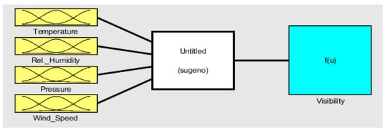 The fuzzy section in Figure 2 comprises the first-order Sugeno inference system. The linear regression output variables and are obtained by executing several fuzzy rules to fuzzy sets of input variables [19,20].