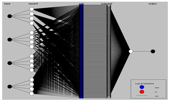 Figure 19 shows the proposed ANFIS model architecture used in this study. This ANFIS design incorporates four input criteria for each of the four input variables, which is referred to as the ‘4444’ FIS configuration. Consequently, there are 256 rules governing the operation of this ANFIS algorithm, as illustrated in Figure 19. Throughout this research, it was determined that an error tolerance of 0.001 and 100 epochs were suitable for training the preferred ANFIS model. The ANFIS architecture employs gaussmf as the input mf type and a linear function as the output mf type, detailed in Table 6.
