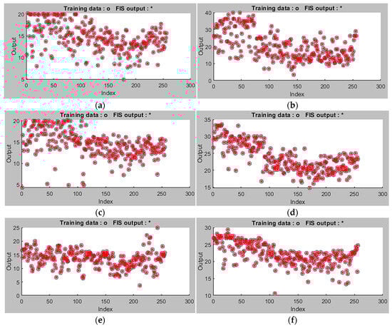 The ANFIS network, as shown in Figure 18, was applied to each of the selected locations using the hybrid architecture in Figure 19. Daily average atmospheric data from the year 2013 were used in this section of the work to predict corresponding visibility data. Time series charts were created by plotting both the training data and FIS output for each city studied in this work against the time index, as shown in Figure 20a–f. This figure displays only 70% of the input data allocated for training, equivalent to the first 256 days within the whole period considered. It was observed that after training, there was a high relationship between the two datasets suggesting very low RMSE value. The estimated training RMSE value for the ANFIS network is shown in Table 6.