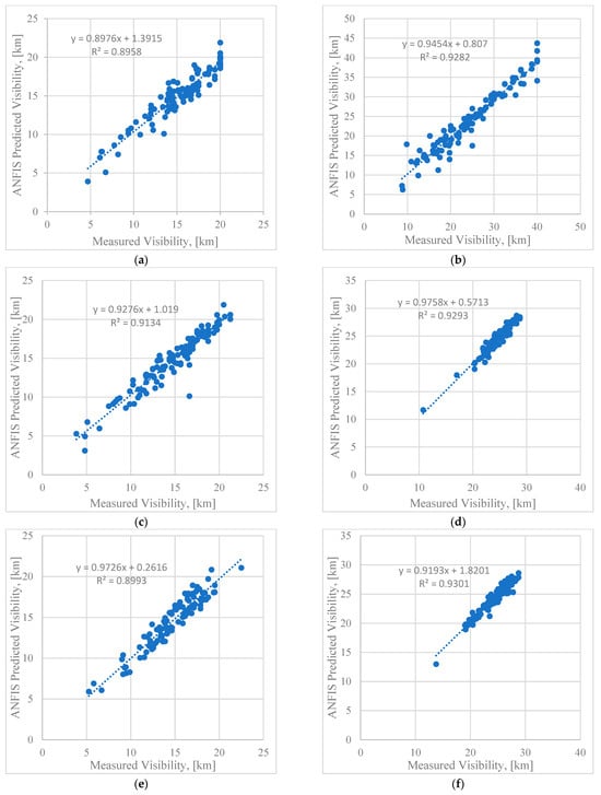 Approximately 30% of the total study period was dedicated to testing the proposed ANFIS model to determine if it was suitable for predicting visibility in this sub-tropical region. Figure 21a–f displays the regression plots of ANFIS-predicted visibility compared to measured visibility data using the allocated testing data. The estimated values for the model testing from the figures are 0.8958, 0.9282, 0.9134, 0.9293, 0.8993, and 0.9301 for DBN, CPT, MTA, BFT, JHB, and MHK, respectively. Therefore, based on the results of the testing data, it was observed that there is a high correlation between the measured and predicted results.